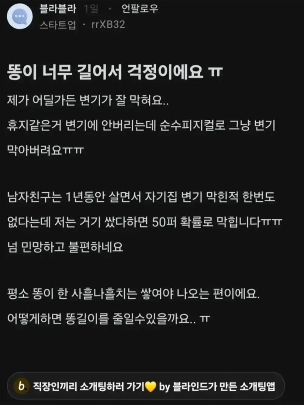 작성자는 평소보다 길어진 배변으로 인해 당황스러운 상황을 겪었다며, 이를 솔직하게 공유함으로써 웃음을 자아냈습니다. 댓글에는 비슷한 경험을 공유하거나 건강과 관련된 조언을 남기는 등 다양한 반응이 이어졌습니다.